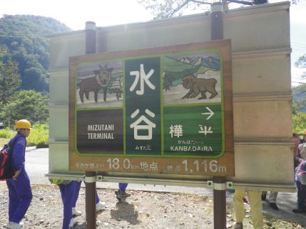 やがて終点・水谷平に到着。すでに12時近くである。砂防事務所水谷出張所や工事用のプレハブが立ち並び、砂防事業の拠点だけあってなんとなく生活感がある処だ。ここでしばし昼食タイム。周囲には水谷の滝、柱状節理、大きなドロノキ、などの見どころがある。