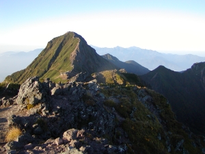 5時少し前、すでに東の空が赤くなっていた。風もほとんどなし。今日も良い天気だ。朝食代わりの弁当(いなり寿司)をもらって、御来光を見てから予定どおり5時半出発。富士山はぼんやりしているが、北アルプス方面はくっきり見えている。なんといってもわかりやすい槍ヶ岳。左は穂高、右は・・・。左手の谷側に長い影が映る。まだ時間が早いせいか行き交う人も少ない縦走路を登ったり下ったりして三叉峰へ。横岳山頂で3人だけの静かな朝食。そこから左側の大同心、小同心を見下ろしながら硫黄岳山荘へ。ここから硫黄岳へはなだらかな登りだ。いつも風が強く、ガスられたらケルンが頼りというこのあたりも、今日は後ろから太陽が照りつけて暑いくらいだ。山頂からはスッパリ切れた火口が怖そうだ。火口壁を右手に見ながら下り、両側に小屋がある夏沢峠に着いた。次のピークへは樹林の中の登りで箕冠山(みかむりやま)、根石岳を通って見晴らしのいい東天狗へ。さすがにこのあたりは人が多い。雲ひとつない空。すばらしい展望で大休止とする。贅沢なひとときだ。黒百合平への道は中山峠経由とし、岩の道を下る。中山峠は見晴らしがないが落ち着いた峠だ。ほんの5分ほどして黒百合ヒュッテに着いた。