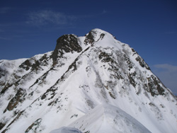 片山さんがラッセル。幸い雪はしまっていて、コルも山腹もそれほど深くない。中岳には思いのほか楽に登ることができた。