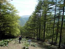 下山路は長かった。ゆるゆる登って鳥小屋という所に着いた。何が鳥小屋だか分らない。ここから斉木林道である。50数年前はトラックが通っていた道なので緩やかである。直ぐに水場に着いた。一息入れる。辺りは相変わらずミズナラ林である。時にはブナ、カエデ、サクラ、ホウノキ、シデ等も混じるがミズナラが主である。林床は相変わらずスズタケだが、ともあれ浅い緑が美しい。若緑が美しい。快晴の空に映えて何とも言えぬいい気分である。であるが、それにもそろそろ飽きて来た頃、やっとの思いで白沢峠に着いた。ここも防火帯になっており、マルバタケブキが群生している。