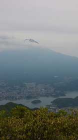 12時過ぎ、黒岳頂上の手前で弁当にした。山頂直下の北斜面には大きく葉を拡げたヤブレガサが群生していた。13:30黒岳山頂(1792m)に着いたが、展望はきかないのでそこから5分ほどの所にある展望台まで行って大休止とした。ここからは正面(南側)にすばらしい展望が開けていた。真正面に富士山がデーンと鎮座し、眼下には河口湖が広がっている。