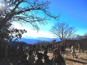 山頂で2班が合流し、正面の真っ白な富士山を見ながら一升瓶の差し入れや持ち寄りの食べ物をごちそうになりゆっくりと昼食に時間をとり、下りは3号路を全員一緒に歩き始めた。振り返ると平坦な路を十数名の行儀良い行進となった。途中、時間調整の休憩をとり清滝駅前に15:30過ぎに到着。ゴミを所定の場所に収め、足早に近くの忘年会会場へと向かった。