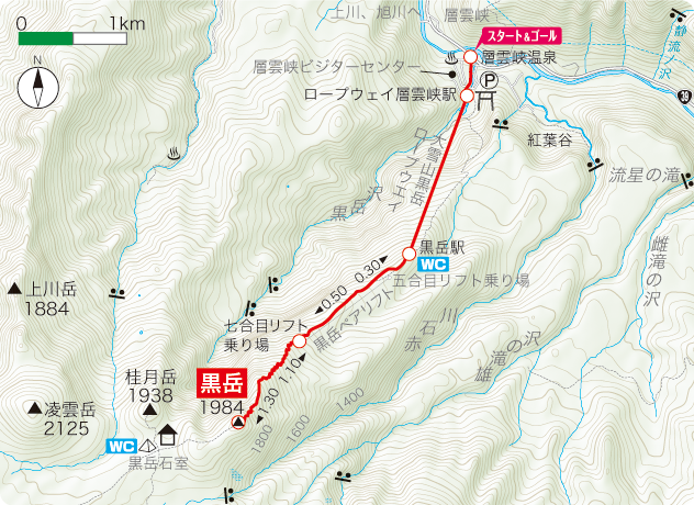 | コース | 670層雲峡駅・ロープウェイ → 1300黒岳五合目駅 → 1320黒岳リフト → 1520黒岳七合目・登山事務所 → 七合目 → 八合目 → 1830九合目 → 1984黒岳山頂 → 1890黒岳石室 |