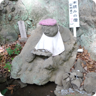 | 本読みの僧 しばらく進むと上級コースのタルワキ沢分岐点に出ます。さらに少し行くと自然探勝路の中間点「本読みの僧」の石仏があります。この辺りは岩が張り出していて、特に落石に注意しましょう |