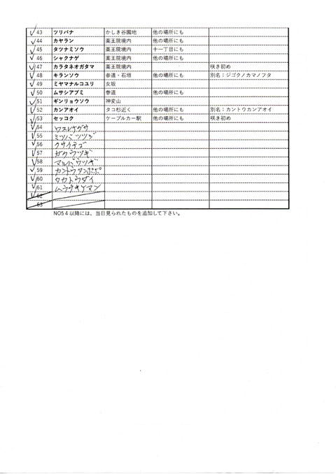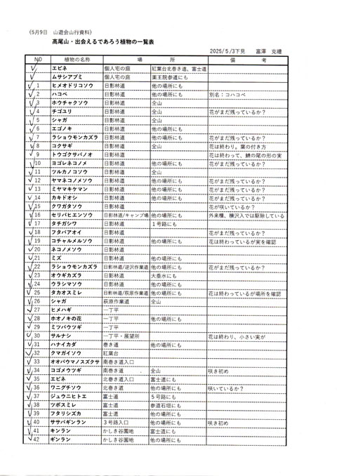 高尾駅北口9時集合 2番乗り場は相変わらずみるみるうちに長蛇の列。 当日のお天気が心配だったが、何とか曇り、富澤講師曰く、花の写真は晴れている時よりも曇っている時のほうが良い写真が撮れるとの事。(やったー!) バスを待つ間に富澤講師から今日の花リストが配られる、53種類もの花の名前が!! ほとんどが聞いたことのない花の名前、ワクワクがいっぱい。 参加予定の岡田さんが都合により欠席。山遊会メンバー5名と富澤講師の6名で出発。
