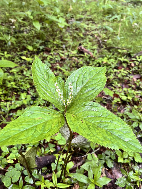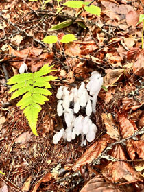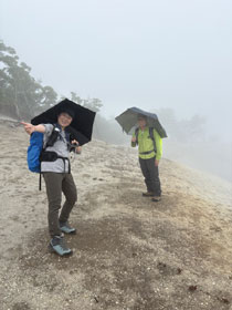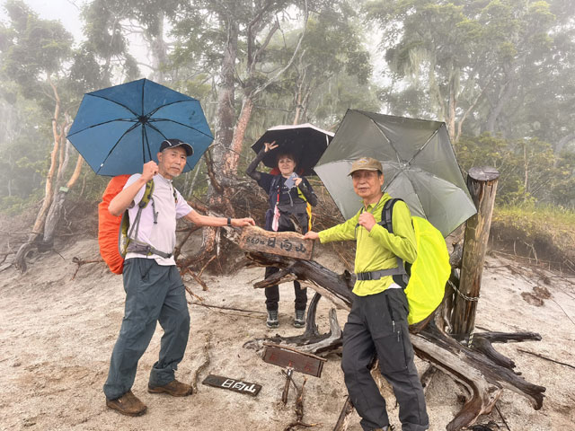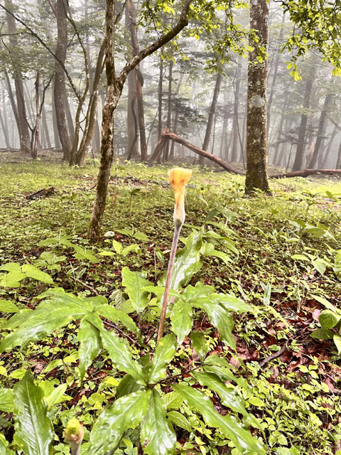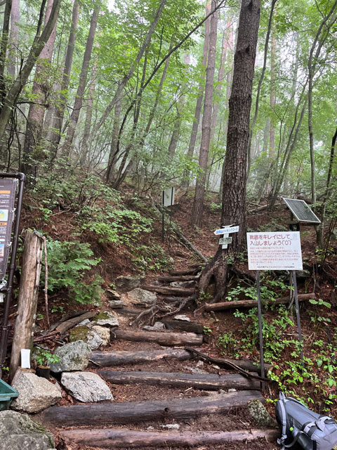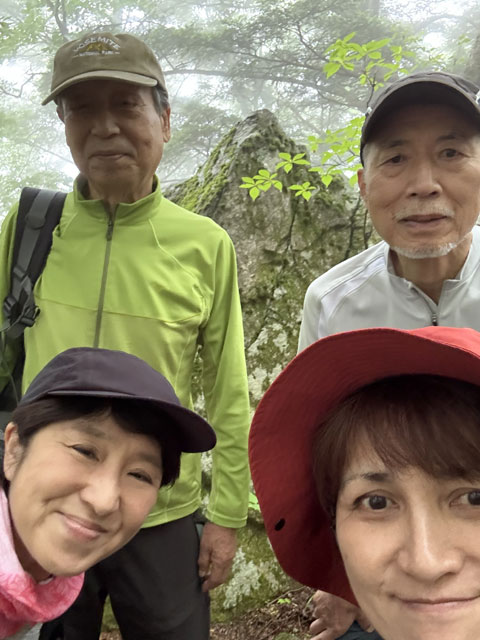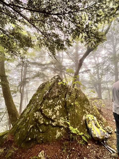 この日の天気予報は前日から雨予報。それでも昼頃までは持ちそうだったため、予定通り日向山への山行を決行しました。 集合場所は小淵沢駅。到着時にはまだ雨は降ってませんでしたが、いまにも降りだしそうな気配でした。 駅からはタクシーで矢立石登山口へ。林道をくねくねと登っていく道中、タクシーが標高を一気に稼いでくれたおかげで、楽に登山口近くまで到着できました。 降車地点は「甲斐駒岩」と呼ばれる、甲斐駒ヶ岳によく似た形をした大岩のそばで、みんなで写真を撮った後、登山スタートとなりました。 |